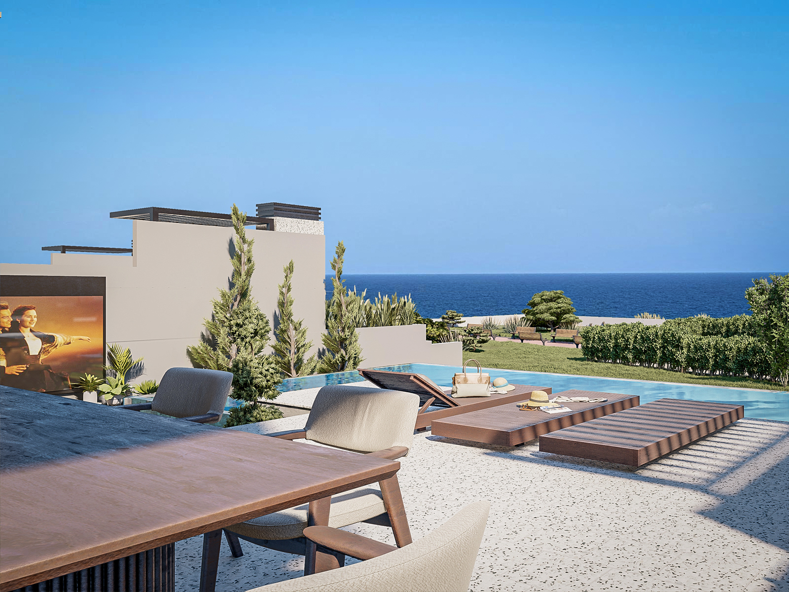 3 yatak odası (her biri ebeveyn banyolu) 1 aktivite odası 1 giriş holü 1 mutfak 1 yemek odası Pencere ve kapılar: Çift camlı alüminyum pencereler Balkon ve teraslar: Cam ve paslanmaz çelik karışımı. Elektrik: Tüm aydınlatma ve prizler Türk Elektrik Mühendisleri Odası standartlarına uygun ve Kıbrıs Onaylı Elektrik Projesine uygun olarak montaj ve montajı yapılmaktadır. Su sistemi Merkezi su deposu yaklaşık 5 tondur. Her villada sıcak su sistemi, su tesisatı, musluklar ve su pompaları mevcuttur. Oturma odası: 5 m yüksekliğinde spot ışıklı asma tavan Şömine: Elektrik bağlantıları VRF klima ünitesi ve bağlantısı TV bağlantısı Sıva Mutfak: Mutfak üniteleri tam donanımlı olup hafif, masif çam veya MDF profillerden yapılmıştır. Tezgah ve lavabo mermerden yapılmıştır. Buzdolabı, derin dondurucu, çamaşır makinesi, bulaşık makinesi, fırın/ocak ve aspiratör elektrik bağlantıları. (Bu cihazlar standart olarak bulunmaktadır.) Musluklar standart olarak bulunmaktadır. Tezgah üstü seramik duvar karoları Seramik yer karoları Spot ışıklı asma tavan Ebeveyn yatak odası: 1 adet Giyinme odası Klima noktası ve ünitesi Elektrik bağlantıları Wi-fi / TV bağlantısı Spot ışıklı asma tavan Ahşap parke zemin Banyolar (her odada) Duvar ve yer karoları: Tam donanımlı duş kabini ve duş perdesi l avabosu ve standart donanımlar Çocuk odası: TV bağlantısı Klima ünitesi ve ünitesi Elektrik bağlantıları Gömme dolaplar Ahşap parke zemin Spot aydınlatmalı asma tavan Çatı terası: Muhteşem deniz, dağ, orman ve gökyüzü manzaralı seyir alanı Jakuzi altyapısı İ ç aydınlatma ve prizler Mutfak Ödeme ve anahtar teslimi ile ilgili ayrıntılar İnşaatın tamamlanması: Dahil Olan Eşyalar – Mutfak beyaz eşyaları – VRF sistemi – Güvenlik kamera sistemi – Akıllı ev sistemi – Dolaplar – Yüzme havuzu İnşaat dönemi – inşaatın başlangıcı – Haziran 2024 – anahtar teslim tarihi – Eylül 2025 Ödemeler için 2 seçenek: 1. Seçenek sözleşmenin imzalanması – depozito ; aylık taksitler (15 ay) Seçenek 2 Tam ödeme peşin ve fiyatta indirim